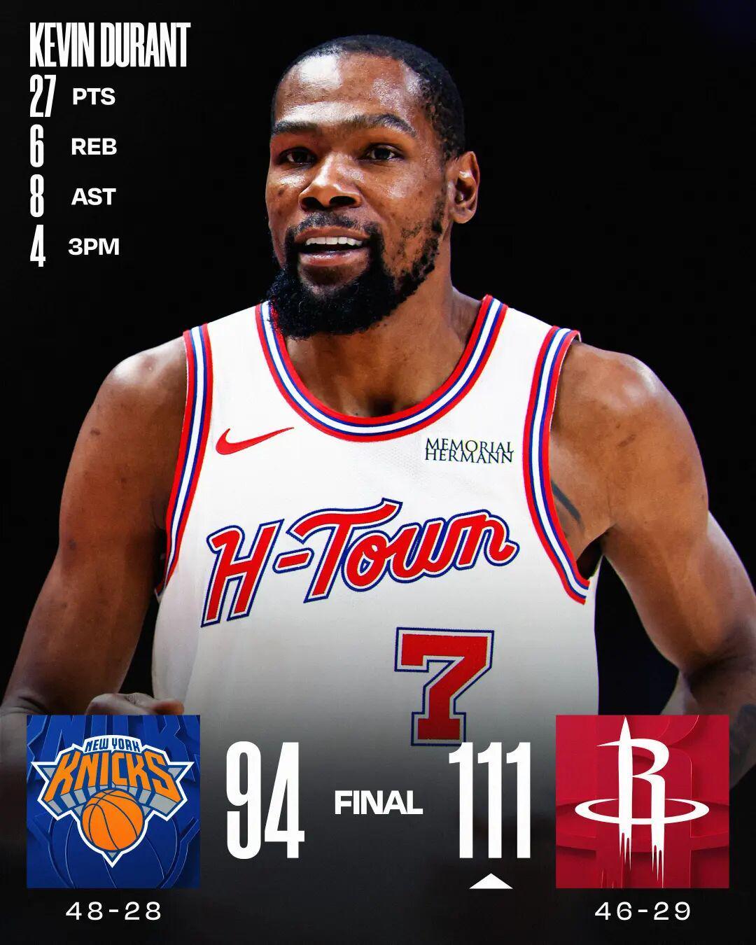 杜兰特27分谢泼德20分 火箭轻取尼克斯